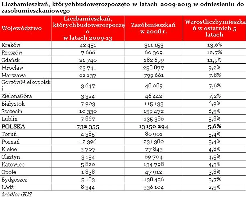 Odnosząc liczbę rozpoczynanych projektów do zasobu mieszkaniowego w danym mieście okazuje się, że w ciągu ostatnich 5 lat w największym stopniu przybyło ich w Krakowie, gdzie zasób powiększył się aż o 13,6 proc. w stosunku do 2008 roku. Wyraźny wzrost odnotowano także w Rzeszowie, gdzie liczba mieszkań wzrosła o 12,7 proc.