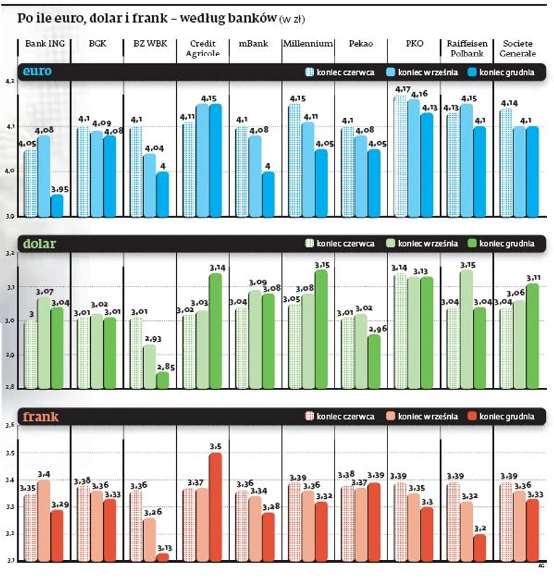 Tak w skrócie wygląda uzasadnienie większości prognoz walutowych, jakie zebraliśmy w największych polskich bankach. Ekonomiści różnią się co do tempa aprecjacji i jej skali. Ale kierunek jest ten sam: po umocnieniu złotego bezpośrednio po decyzji EBC (wczoraj euro na rynku kosztowało około 4,10 zł) na zbliżonym poziomie utrzyma się on przez cały trzeci kwartał. W ostatnich miesiącach roku może jeszcze zyskać, pod koniec grudnia euro mogłoby kosztować 4,06 złotego. Potanieje również frank: do 3,35 zł pod koniec września i 3,31 zł w grudniu. Wczoraj kosztował on 3,37 zł.