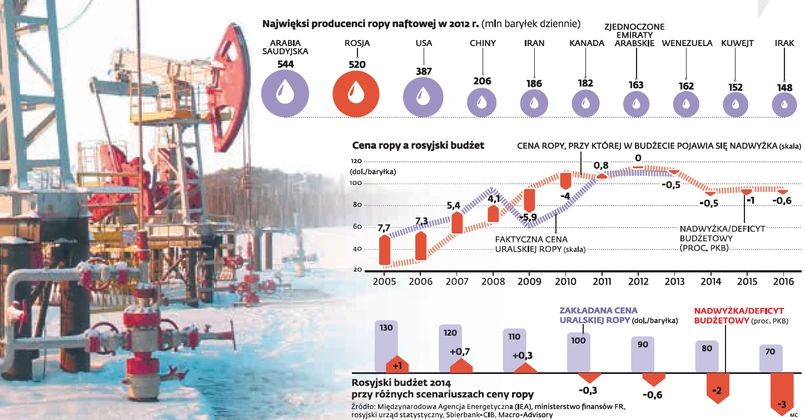 Z tym że chętnych na rosyjskie papiery dłużne pewnie nie byłoby zbyt wielu, bowiem obecnie agencja S&P wystawia im rating BBB-, czyli najniższy szczebel inwestycyjny. Podczas długotrwałego spadku cen ropy Moskwa stanęłaby wobec konieczności szukania inwestorów na gwałt, co znacznie podwyższyłoby koszty obsługi długu. Sytuację mógłby jednak uratować bank centralny, który zgromadził olbrzymie rezerwy w wysokości 470 mld dol. A ponieważ rubel słabnie zazwyczaj wraz ze spadkiem cen ropy, zapewniłoby to dodatkową poduszkę dla rosyjskiego budżetu. Tak jak to miało miejsce w 2012 r., kiedy notowania baryłki spadły ze 120 do 90 dol.