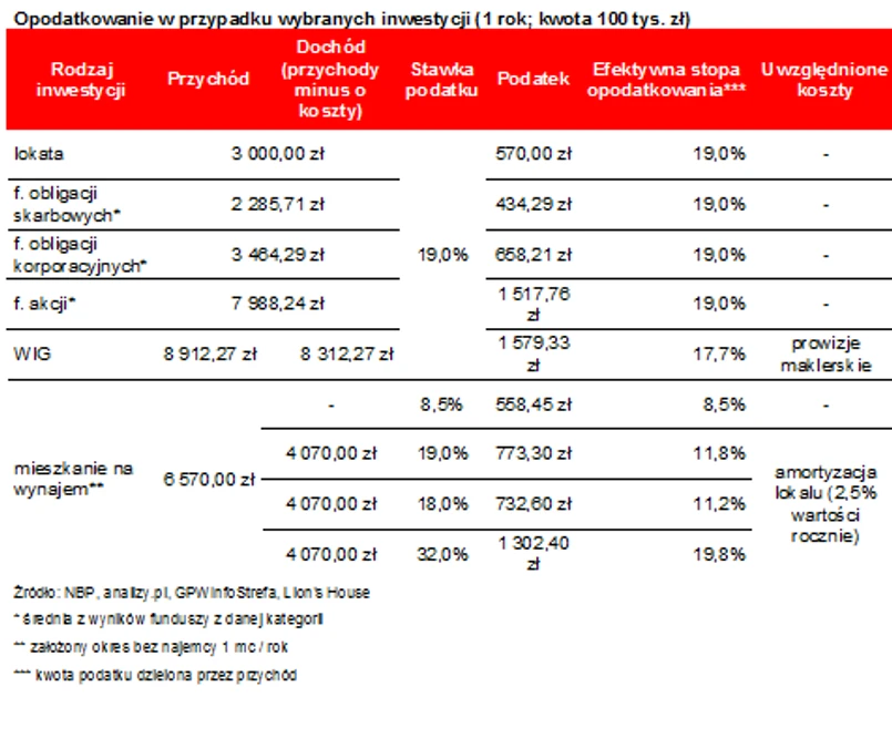 Pomaga w tym też amortyzacja, która działa na korzyść inwestora tylko w przypadku nielicznych produktów inwestycyjnych. Aby je porównać Lion’s Bank przygotował przegląd ich wyników i obciążeń podatkowych za ostatnie 12 miesięcy.
