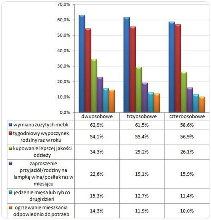 Badanie trwało od maja do lipca 2012 roku. Ankietowani wskazali m.in., które potrzeby jest im najtrudniej zrealizować. Aż 60% z nich stwierdziło, że nie jest ich stać na wymianę zużytych mebli. Ponad połowa badanych nie mogła pozwolić sobie na wakacje z rodziną raz w roku.