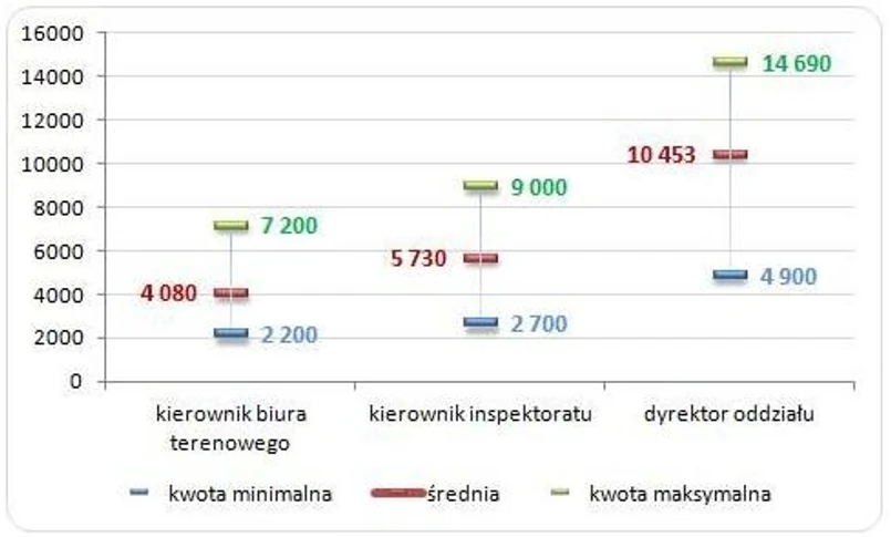 Pracujący na stanowisku dyrektorskim otrzymują jednak średnio 10 453 zł. Przeciętne zarobki kierowników inspektoratu wynoszą 5 730 zł. Maksymalna pensja na tym stanowisku wynosi 9 tys. zł. Wynagrodzenie kierownika prowadzącego biuro terenowe mieści się w przedziale 2,2 tys. do 7,2 tys. zł. Średnie zarobki osób zatrudnionych na tym stanowisku wynoszą 4 080 zł. Warto pamiętać, że wszystkie te kwoty dotyczą wynagrodzeń zasadniczych i nie obejmują dodatków.