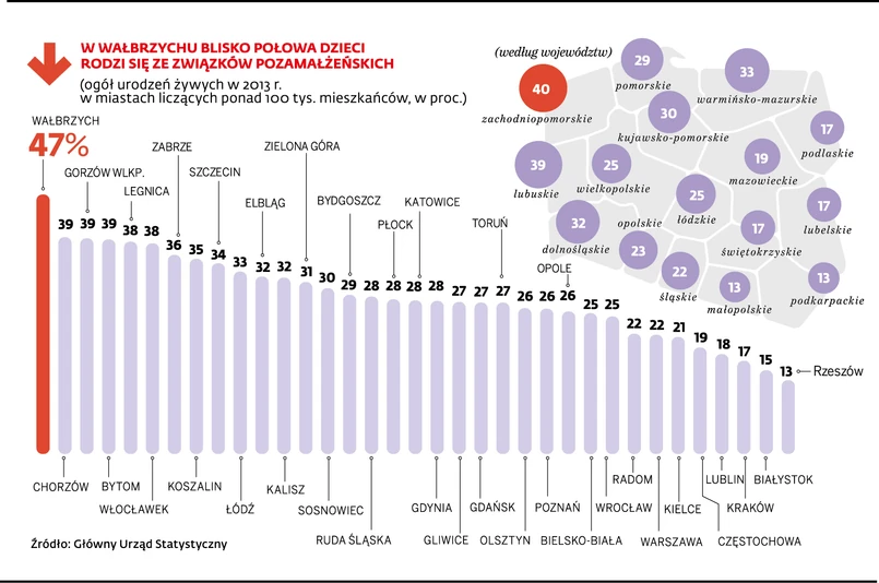 Zjawisko to jest jednak mocno zróżnicowane regionalnie. I tak w ubiegłym roku wśród dzieci urodzonych w Zachodniopomorskiem aż 40,4 proc. przyszło na świat ze związków pozamałżeńskich. To odsetek porównywalny do bardziej liberalnych państw Europy. Powód? Ściana zachodnia została po wojnie na nowo zasiedlona, co spowodowało rozerwanie tradycyjnych więzi społecznych i w efekcie zwiększyło akceptację dla nieformalnych związków. Na drugim biegunie znajduje się Małopolska, gdzie poza małżeństwem rodzi się 12,7 proc. dzieci. Spośród państw UE jedynie w prawosławnej Grecji wartość ta jest niższa.