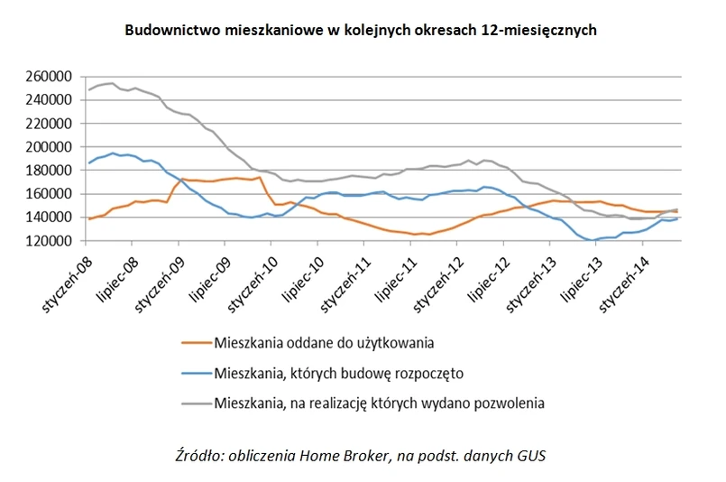 W ciągu ostatnich 12 miesięcy deweloperzy rozpoczęli budowę 60,2 tys. nowych mieszkań, to o 35,5 proc. więcej niż rok wcześniej - wynika z obliczeń Home Brokera przeprowadzonych na bazie danych opublikowanych przez Główny Urząd Statystyczny. Rośnie także liczba pozwoleń na budowę wydanych deweloperom. W samym maju było ich 5,2 tys., czyli o 16,5 proc. więcej niż w maju 2013 r. Przez ostatnie 12 miesięcy firmy zajmujące się budową mieszkań otrzymały 65,3 tys. pozwoleń, co jest wielkością o 8,7 proc. większą od tej sprzed roku. Spadki obserwujemy za to w mieszkaniach oddanych do użytkowania. Od czerwca 2013 r. do maja 2014 r. deweloperzy oddali 57,7 tys. mieszkań, o 7 proc. mniej niż rok temu.