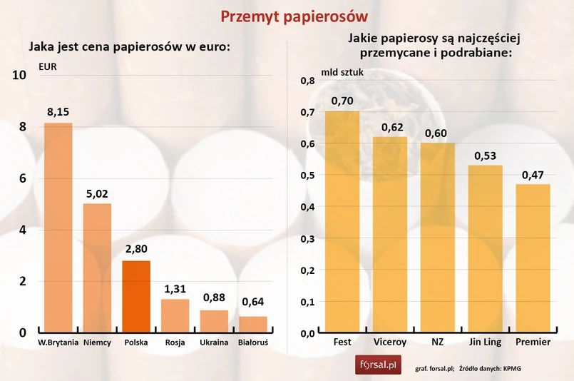 Jakie to oznacza straty? Jak wyliczają koncerny, wynoszą one ok. 685 mln euro, czyli ok. 2,84 mld zł. Tyle bowiem wyniosłyby wpływ do budżetu państwa z tytułu podatku akcyzowego, jeśli papierosy te zostałyby legalnie zakupione w Polsce. Blisko połowa, czyli 49 proc. nielegalnych papierosów, a dokładnie 2,97 mld sztuk, pochodzi z Białorusi. Drugim źródłem przemytu jest Rosja – 0,64 mld sztuk, a trzecim Ukraina – 0,30 mld sztuk. Papierosy szmuglowane są także z Niemiec – 0,10 mld sztuk. Najczęściej przemycane i podrabiane marki to Fest i Viceroy.
