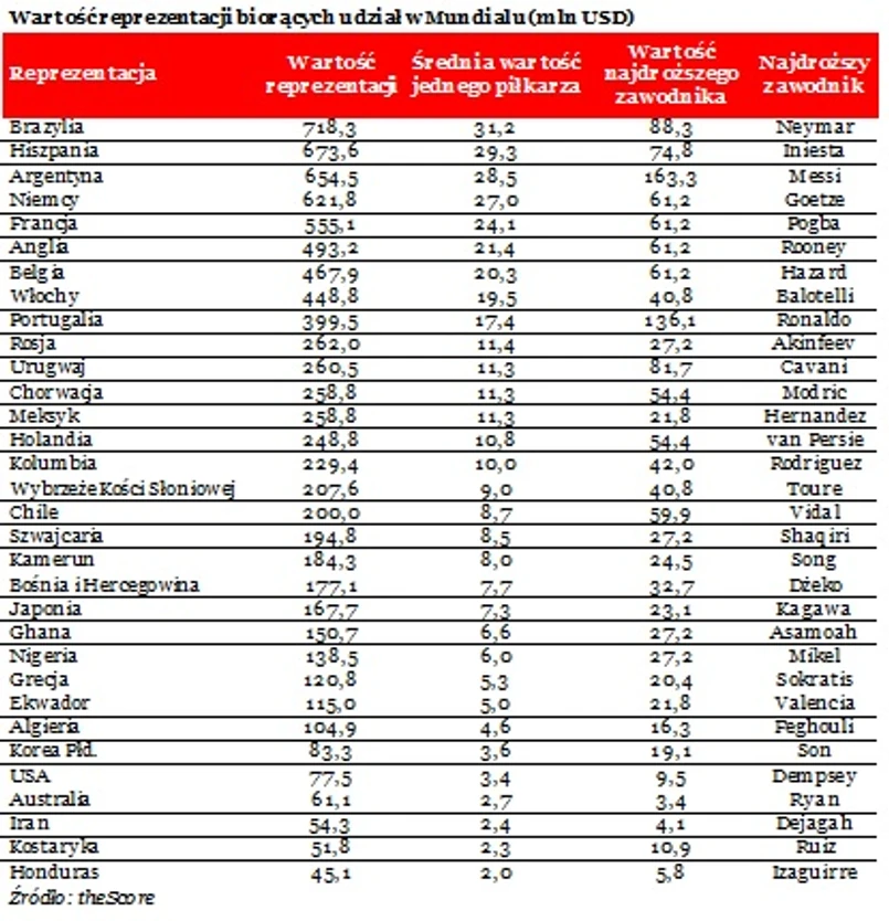 Z danych zebranych przez portal theScore wynika, że najdroższą drużyną biorącą udział w tegorocznym Mistrzostwach Świata w piłce nożnej jest Brazylia. Wartość rynkowa całej reprezentacji (23 zawodników) to 718,3 mln USD, co oznacza, że jeden piłkarz gospodarzy wart jest przeciętnie 31,2 mln USD. Najdroższy brazylijski gracz, Neymar, wyceniany jest przez portal transfermarkt.com na ponad 88 mln USD. Drugie miejsce pod względem wartości reprezentacji zajmuje Hiszpania, której zawodników wyceniono na 673,6 mln USD. O blisko 20 mln USD mniej warta jest cała ekipa Argentyny, zaś 23 niemieckich zawodników wyceniono na 621,8 mln USD.