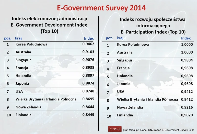 Pierwsze miejsce w najnowszym raporcie ONZ E-Government Survey 2014 zajęła Korea Południowa, drugie Australia, a trzecie Singapur. Wyżej niż Polska uplasowały się m.in. Słowenia, Litwa, Łotwa, Chile, Rosja, Węgry, a nawet Kazachstan.