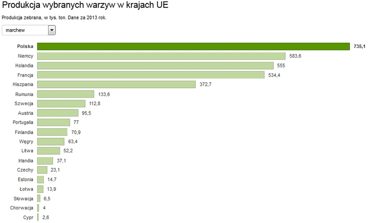 Pozycję lidera w 2013 roku zajęliśmy w produkcji marchwi (735,1 tys. ton w 2013 r.) oraz białej kapusty (953,8 tys. ton). W innych kategoriach najczęściej prześciga nas Hiszpania - położona w nieco cieplejszym klimacie - a także Niemcy, Holandia i Francja.