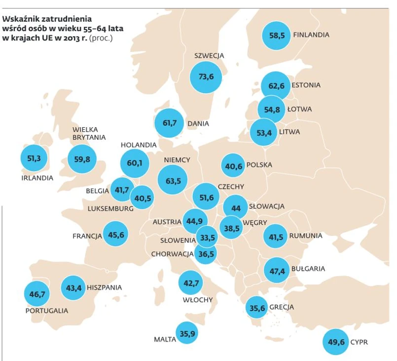 Wprawdzie zwiększył się wskaźnik zatrudnienia w ostatnich latach wśród osób w wieku 55–64 lata, do 40,6 proc. w ubiegłym roku z 31,6 proc. w 2008 r., gdy rozpoczęto realizację programu Solidarność pokoleń 50 plus. Jednak jest to przede wszystkim efekt zdecydowanego ograniczenia przywilejów emerytalnych. Daleko nam przy tym do średniej Unii Europejskiej. W UE pracuje średnio ponad połowa osób w tym wieku. W Szwecji – 73,6 proc., w Niemczech – 63,5 proc., w Holandii – 60,1 proc., a w Wielkiej Brytanii – 59,8 proc.