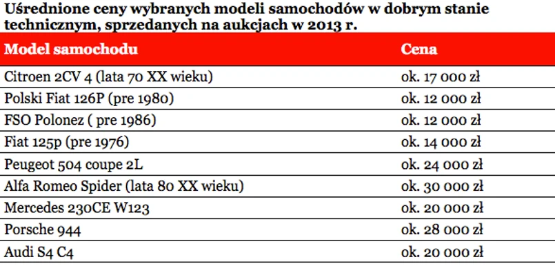Przykładowe samochody warte zainteresowania pod kątem budowania „kolekcji hobbystycznej” to: Citroen 2CV, PF126p wyprodukowany przed 1980 rokiem, wczesne modele FSO Polonez czy też PF125p, Peugeot 504 coupe, Alfa Romeo Spider z lat 80., Mercedes 230CE typ W123, Porsche 944, Audi S4 typ C4.