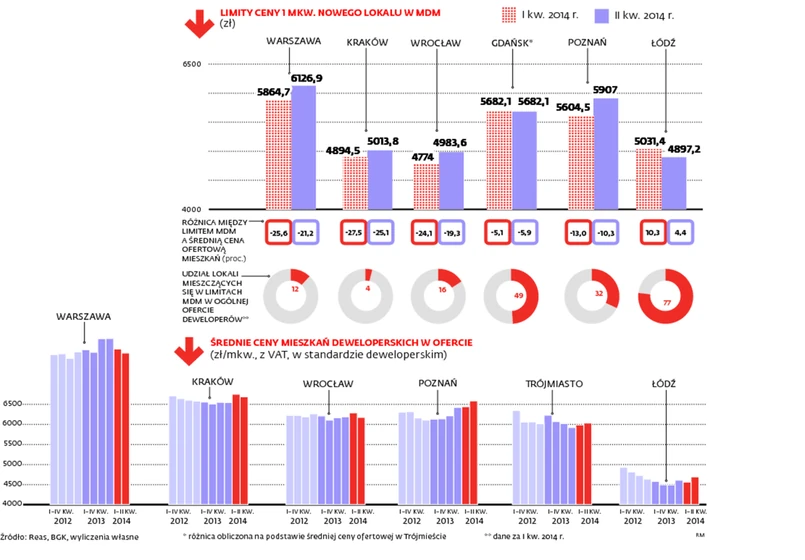 W tym mieście limity MdM mocno oddziałują też na rynek wtórny. Magdalena Szabelska, właścicielka lokalnego biura nieruchomości, mówi, że z konkurencją mieszkań spełniających kryteria programu muszą liczyć się właściciele tańszych, bardziej oddalonych od centrum dzielnic. Potwierdzają to m.in. dane agencji Metrohouse. Tylko w czerwcu średnia cena transakcyjna na rynku wtórnym spadła w Gdańsku o 3,7 proc. do 4779 zł za mkw. W porównaniu z tym samym okresem 2013 r. spadek wyniósł 9,6 proc.