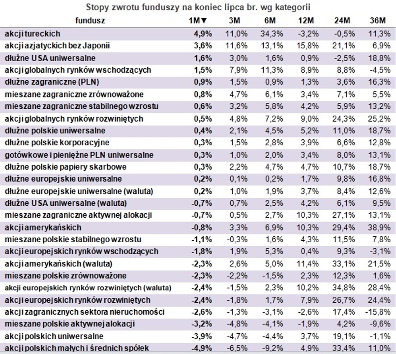 Najlepiej wypadły fundusze akcji tureckich, które miesiąc zamknęły ze średnią stopą zwrotu na poziomie 4,9 proc. Najlepszym wśród nich funduszem był UniAkcje: Turcja, którego jednostki zyskały 6,9 proc. Przy okazji był to też fundusz o najwyższej stopie zwrotu w lipcu, jak i od początku bieżącego roku (29,1 proc.). W ogóle tegorocznym hitem inwestycyjnym jak na razie są właśnie fundusze inwestujące w Turcji. Średnia dla tej grupy produktów to już blisko 23 proc.