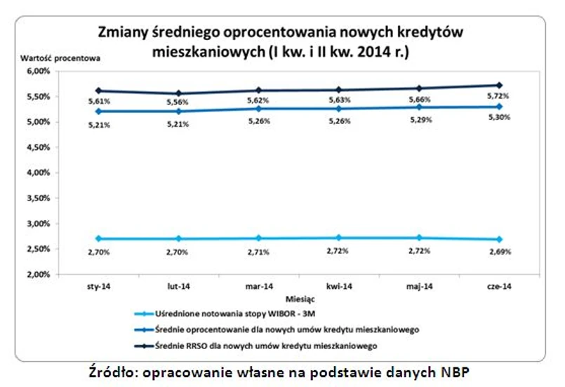 W ramach odpowiedzi na pytanie zadane przez NBP aż 35% wiodących banków potwierdziło, że od kwietnia do czerwca wzrosły marże ich kredytów mieszkaniowych. Skutki tej zmiany można zaobserwować na poniższym wykresie. Szacunki Narodowego Banku Polskiego wskazują, że w poprzednim kwartale średnie oprocentowanie nowych „hipotek” zwiększyło się z 5,26 proc. do 5,30 proc. Bardziej widoczna zmiana dotyczyła Rzeczywistej Rocznej Stopy Oprocentowania (RRSO). Ten miernik prócz odsetek uwzględnia również inne koszty, które są związane z zaciągnięciem kredytu (np. prowizję przygotowawczą, wymagane opłaty oraz składki ubezpieczeniowe). Jak widać na poniższym wykresie od kwietnia do czerwca przeciętne RRSO dla nowych „hipotek” wzrosło z 5,63 proc. do 5,72 proc.