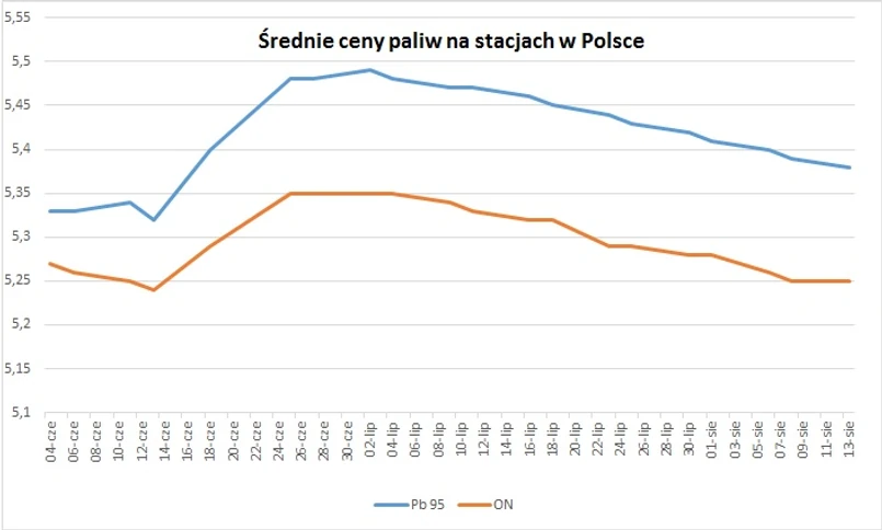 Druga połowa czerwca mogła zaniepokoić kierowców: w bardzo krótkim czasie średnia cena detaliczna litra oleju napędowego na stacjach wzrosła o 11 groszy, zaś litra benzyny – nawet o 17 groszy. Jeśli ktoś wyjeżdżał na urlop w pierwszych dniach lipca płacił za paliwo przeciętnie 5,35 zł/l za ON i 5,49 zł/l Pb 95 – wynika ze statystyk Polskiej Izby Paliw Płynnych.
