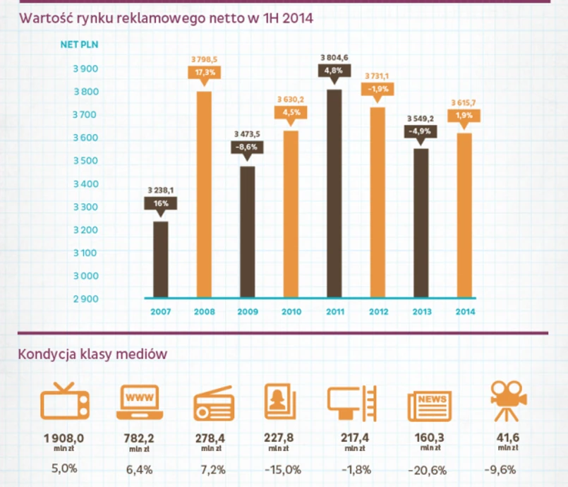Negatywny wpływ na dynamikę rynku reklamy, podobnie jak w ostatnich kwartałach, ma telekomunikacja. W pierwszym półroczu 2014 wydatki reklamowe tego sektora spadły o 33,8 mln złotych (tj. o -9,3 proc.) wobec analogicznego okresu w roku ubiegłym. O przeszło 7 proc. mniej na reklamę wydawały też instytucje finansowe.