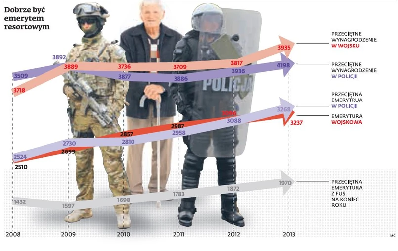 Średnia pensja w armii wzrosła od 2008 roku o ok. 7 proc. Emerytura wypłacana wojskowym zwiększyła się o blisko 30 proc. W policji różnica była mniejsza, ale również spora. Wynagrodzenie wzrosło ok. 15 proc., emerytura dwukrotnie więcej. Dla porównania według GUS przeciętna pensja urosła w tym czasie o 24 proc. W efekcie o ile w 2008 r. w policji średnie wynagrodzenie było wyższe od przeciętnej emerytury o 40 proc., to w zeszłym roku już tylko o 27 proc.