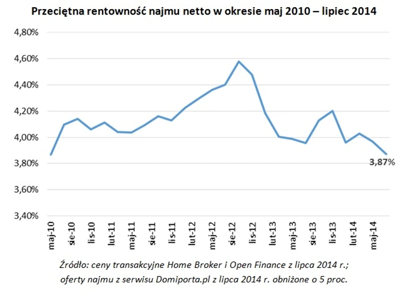 W pięciu z siedmiu badanych przez Home Broker i Domiporta.pl miast oczekiwana stopa zwrotu z inwestycji w mieszkanie na wynajem w ujęciu netto w ciągu dwóch ostatnich miesięcy spadła. Tak samo wygląda to, gdy porównamy obecne dane do tych sprzed roku – wyraźnie widoczny jest trend spadkowy. Przeciętna rentowność najmu netto liczona dla Gdańska, Gdyni, Krakowa, Łodzi, Poznania, Warszawy oraz Wrocławia spadła w lipcu do 3,87 proc., to najniższa wartość od listopada 2011 roku.