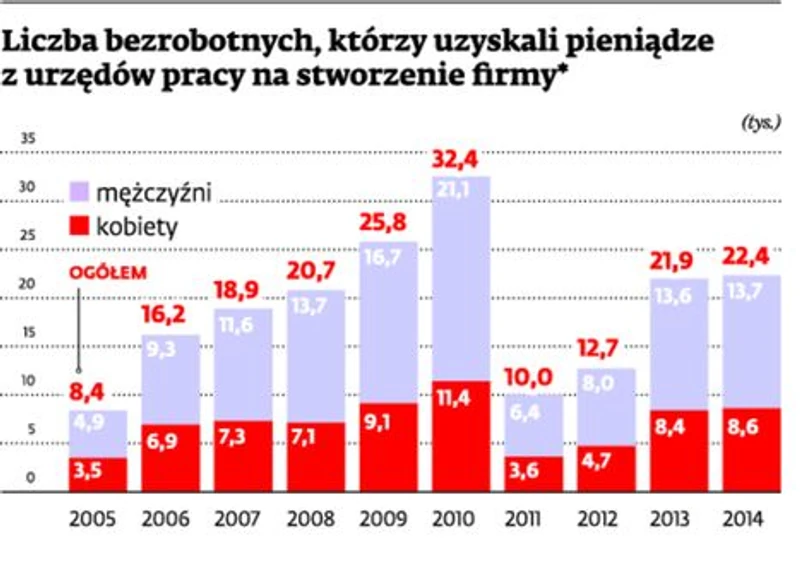Tak czy inaczej, w tym roku w całym kraju bezrobotni mogą stworzyć ponad 46 tys. firm, być może nawet więcej niż w ubiegłym roku, ponieważ w pierwszych sześciu miesiącach 2014 r. ich liczba była o ponad 400 większa niż przed rokiem. To będzie oznaczało, że od 2005 r. z dotacji pośredniaków skorzysta ok. 460 tys. bezrobotnych. A na ten cel wydane zostanie z Funduszu Pracy łącznie ze środkami planowanymi na ten rok prawie 6,7 mld zł.