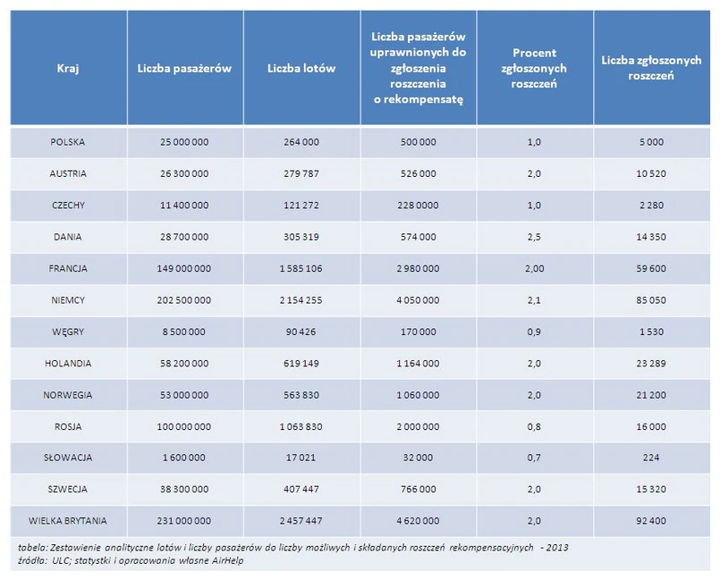 Najwyższy jest w Danii, ale tam rocznie odbywa się ponad 300 tys. lotów, a liczba podróżnych sięga ponad 28 mln. Na poziomie 2 proc., czyli dwa razy większym niż w Polsce, skala roszczeń wynosi w Austrii, Francji, Niemiec, Holandii czy Norwegii, Szwecji, Wielkiej Brytanii. Słabiej od Polski wypada na tym tle Słowacja, Rosja, czy Węgry.