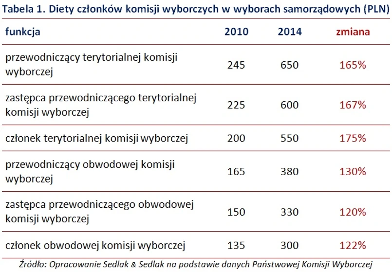 Dla przewodniczących obwodowych komisji wyborczych została przewidziana dieta w wysokości 380 zł, a dla ich zastępców – 330 zł. Najmniej zarobią członkowie obwodowych komisji wyborczych – 300 zł. Jednak ich wynagrodzenie będzie również ponad dwukrotnie wyższe niż w wyborach z roku 2010.