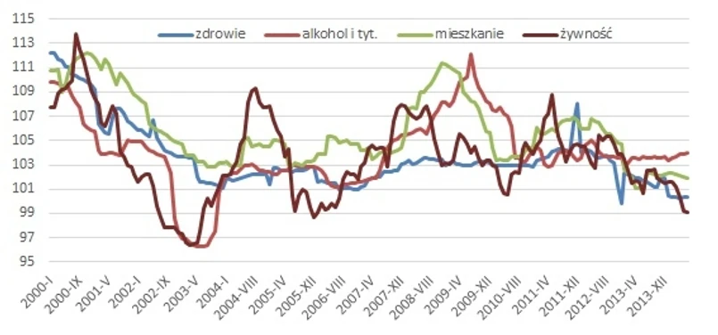 Przed deflacją tradycyjnie już bronić nas będą nieustannie rosnące ceny napojów alkoholowych i wyrobów tytoniowych. Tempo ich wzrostu od kilku lat trzyma się na poziomie 3-4 proc. Nigdy w historii nie zdarzył się spadek cen wydatków związanych z użytkowaniem mieszkania i nośnikami energii. Ich lipcowa zwyżka o zaledwie 0,7 proc. to ewenement, gdyż zwykle szły one w górę o co najmniej 2 proc. Trzeba więc liczyć się z tym, że wkrótce powrócą do typowego dla siebie tempa. Niezbyt wrażliwe na spowolnienie są także ceny płacone za usługi i towary związane z kulturą i rekreacją. Zmniejszenie się ich dynamiki do 0,3-0,7 proc., obserwowane od kwietnia także można uznać za nietypowe, bowiem zwykle wynosi ona 3-4 proc. Utrzymujące się na niższym poziomie już od półtora roku koszty transportu, zawdzięczamy nie tylko stabilnym i niskim notowaniom ropy naftowej, ale także w dużym stopniu mocnemu złotemu. Już w najbliższych miesiącach ten ostatni czynnik przestanie działać na korzyść tankujących paliwo. Złoty będzie słabszy wobec dolara nie tylko wskutek przejściowych, miejmy nadzieję, zawirowań ukraińsko-rosyjskich, ale w konsekwencji trwałego umocnienia dolara. Niebawem zniknie też sięgający 6 proc. efekt ubiegłorocznych decyzji obniżających opłaty za przedszkola i koszty związane z edukacją przestaną działać pro deflacyjnie, choć ich udział w wydatkach wynoszący 1,17 proc. jest niewielki.