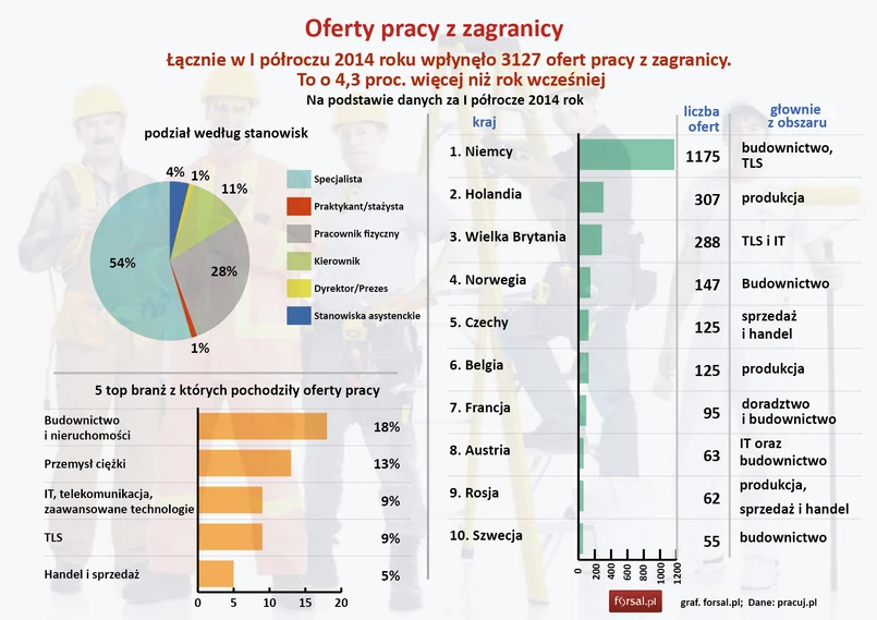 Z analizy ofert pracy napływających z zagranicy wyłania się zaskakujący obraz polskiego pracownika. Stereotypowo uważa się, że Polak pracuje za granicą jako robotnik albo na zmywaku. Okazuje się jednak, że ponad połowa ofert pracy w serwisie Pracuj.pl dotyczyła specjalistycznych stanowisk (54 proc.). Oferty dla pracowników fizycznych to jedynie 28 proc. Polacy pracują też na kierowniczych posadach. Tego typu pracy dotyczyło 11 proc. ofert. - Nasi inżynierowie są w Niemczech, w Norwegii czy we Włoszech po prostu rozchwytywani - mówi IAR Tomasz Szpikowski, prezes firmy świadczącej usługi inżynieryjne w wielu krajach.