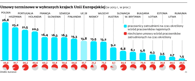 Większość z nich nie jest z tego zadowolona. Wskazują na to badania Eurostatu – urzędu statystycznego Komisji Europejskiej. Według nich aż 66,8 proc. (2,2 mln) Polaków zatrudnionych na czas określony twierdziło w ubiegłym roku, że pracuje na podstawie niechcianych umów. Podpisało je tylko dlatego, że nie mogło znaleźć stałej pracy. Z tych samych powodów godzą się na kontrakty terminowe pracownicy zatrudnieni w innych państwach Unii Europejskiej. Ale choć odsetek takich umów jest tam zdecydowanie mniejszy niż w Polsce (w tym rankingu jesteśmy liderem we Wspólnocie), to niezadowolonych z nich jest w 11 krajach nawet więcej niż u nas. Bo są one niechciane wśród 70–95 proc. pracowników, na przykład w Hiszpanii, Rumunii, na Słowacji, w Portugalii, Czechach, Włoszech czy na Węgrzech.