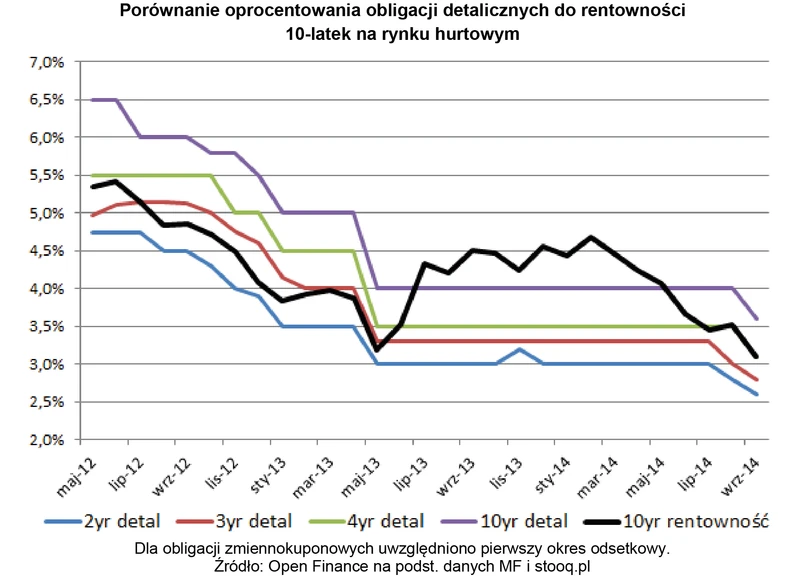 Wydawałoby się, że rentowności obligacji skarbowych na rynku hurtowym są drogowskazem dla papierów oferowanych inwestorom indywidualnym. Tymczasem ostatnie kilkanaście miesięcy pokazało, że nie zawsze jest to prawdą. Podczas gdy od maja ubiegłego roku do końca lipca tego roku odsetki oferowane w detalu ani drgnęły (w przypadku papierów 3-, 4- i 10-letnich mówimy o pierwszym okresie odsetkowym), to rentowność 10-latek na rynku zmieniała się od 4,9 do 3,1 proc. Wprawdzie porównywanie oprocentowania wyłącznie do rentowności papierów 10-letnich jest pewnym uproszczeniem, ale pokazuje do jak wysokich różnic może dochodzić.