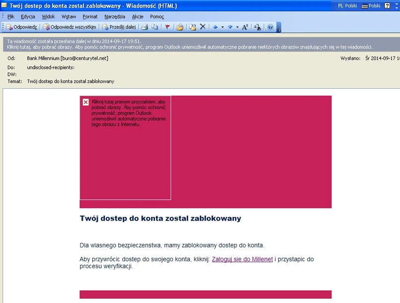 Wczoraj na skrzynki klientów banku Millennium trafiały fałszywe maile z informacją o zablokowaniu dostępu. Link odsyłał na fałszywą stronę, której celem było prawdopodobnie wyłudzenie wrażliwych danych. Jak poinformował rzecznik prasowy Millennium, Wojciech Kaczorowski, do samego banku pierwsze informacje o pojawieniu się fałszywych maili dotarły wczoraj po południu.