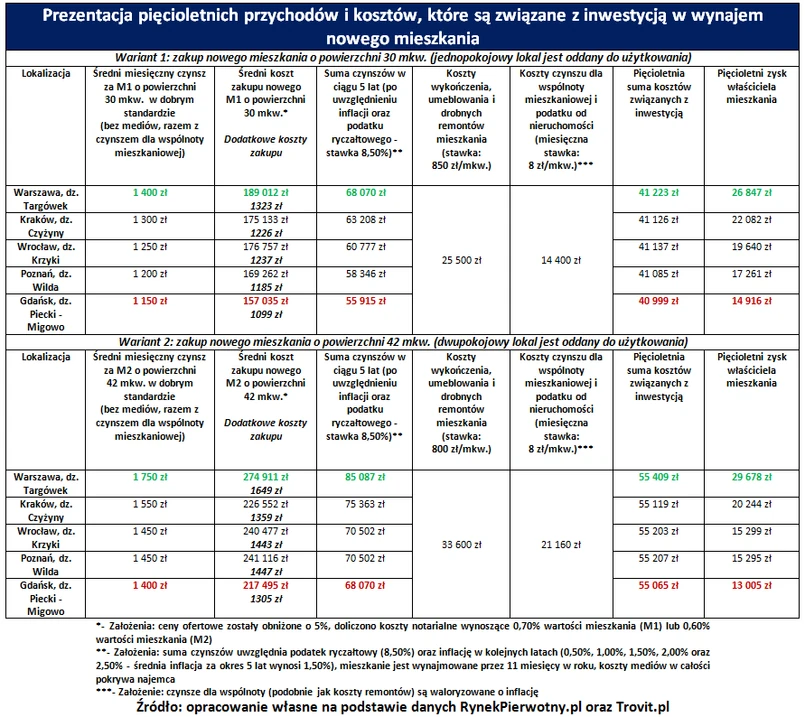 Poniższa tabela prezentuje informacje na temat pięciu atrakcyjnych lokalizacji. Dzięki danym portalu RynekPierwotny.pl zostały określone średnie ceny M1 oraz M2, które deweloperzy oferują w analizowanych częściach Warszawy, Krakowa, Wrocławia, Poznania i Gdańska. Po skonfrontowaniu tych informacji z lokalnymi stawkami czynszów można wstępnie stwierdzić, że najbardziej zyskowny jest wynajem warszawskich lokali. W ramach bardziej dokładnej analizy, która obejmuje okres 5 lat trzeba uwzględnić koszty związane z: