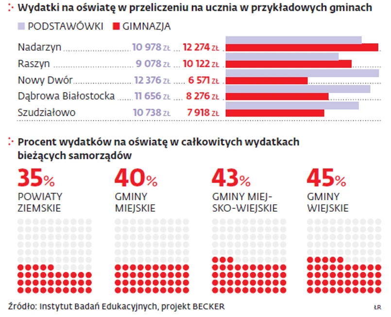 Jak pokazują badania, wynagrodzenia dla nauczycieli i administracji to zwykle około połowy wydatków na szkoły. Choć i tu są wyjątki – w Janowie pensje pochłaniają aż 72 proc. Utrzymanie budynków, opłaty za wodę i ogrzewanie, przeglądy techniczne czy wywóz śmieci – średnio kolejne 30 proc. W niektórych gminach aż 10 proc. budżetu pochłania dowożenie dzieci do szkół. Tak jest na przykład w Suchowoli. W części gmin wiejskich do szkół podstawowych dowożonych jest nawet 60 proc. uczniów, a do gimnazjów – 80 proc. Wszystko przez duże odległości między placówkami.