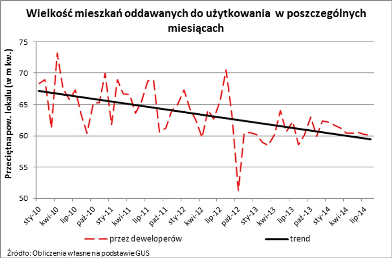 Trend do budowania coraz mniejszych mieszkań nie jest nowością. Wszystko zaczęło się wraz z pierwszymi oznakami kryzysu. Już w 2007 roku deweloperzy obawiając się nastania lat chudych przeprojektowywali swoje budynki dążąc do obniżenia całkowitych cen swoich lokali. Coraz częściej pojawiały się kawalerki o powierzchni 25 – 30 m kw., czy dwupokojowe mieszkania na 35 – 40 metrach. Wprowadzanie takich nieruchomości do oferty spowodowało, że już od końca 2008 roku przeciętna powierzchna lokalu oddawanego do użytkowania przez deweloperów zaczęła maleć. Do takich wniosków można dojść biorąc pod uwagę dane uśrednione dla okresów rocznych. Pozwala to ograniczyć zmienność wyników pozbywając się wpływu zdarzeń przypadkowych oraz sezonowości. Tak przetworzone dane publikowane przez GUS pokazują, że w szczytowym momencie (październik 2008 r.) przeciętna powierzchnia mieszkania oddawanego do użytkowania przez deweloperów wyniosła 68,3 m kw. Dziś – po prawie 6 latach – przeciętny metraż zmalał do 60,7 m kw. (średnia dla okresu od września 2013 r.- do sierpnia 2014 r.). Jest to także niemal najniższy wynik w historii badania (stosowne dane są dostępne od 2006 r.). Mieszkania o mniejszej powierzchni deweloperzy oddawali do użytkowania jedynie w sierpniu i wrześniu 2013 r.