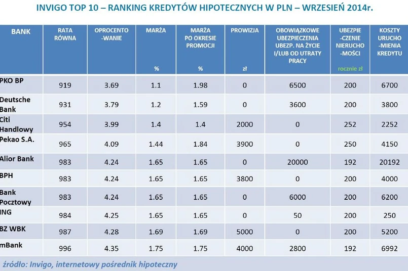 Wrześniowy ranking Invigo TOP 10 tradycyjnie już otwiera bank PKO BP, który nieustannie broni swojej czołowej pozycji. Propozycja PKO BP oparta o marżę 1,1 proc. i zerową prowizję nadal pozostaje jedną z ciekawszych ofert dla osób poszukujących kredytu. Warto jednak wiedzieć, że wspomniane atrakcyjne warunki - promocyjna marża w pierwszym roku kredytowania i brak prowizji są oferowane klientom, którzy posiadają lub otworzą konto w banku, wykupią ubezpieczenie od utraty pracy na okres 4 lat oraz nabędą kartę kredytową i/lub skorzystają z ubezpieczenia na życie oferowanego przez bank. W kolejnych latach trwania kredytu marża wzrośnie do poziomu 1,98 co spowoduje wzrost raty do 1022 zł. Koszt ubezpieczenia od utraty pracy i hospitalizacji warunkujących skorzystanie z oferty wynosi 3,25 proc. od kwoty kredytu.