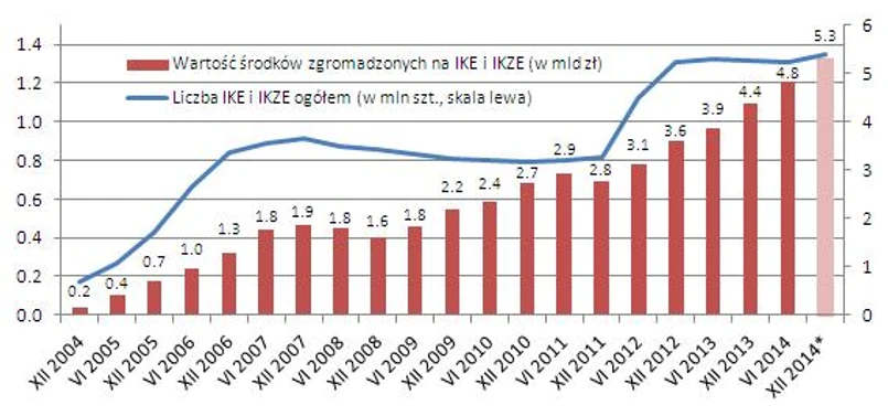 Po dziesięciu latach od wprowadzenia możliwości oszczędzania na dodatkową emeryturę w ramach indywidualnego konta emerytalnego (IKE), otrzymując w zamian warunkowe zwolnienie z podatku od zysków kapitałowych, Polacy zgromadzili na nich według ostatnich danych KNF 4,67 mld zł. Na wprowadzonych dopiero w 2012 roku indywidualnych kontach zabezpieczenia emerytalnego (IKZE), zebraliśmy jak dotąd 155 mln zł. Łącznie daje to więc już ponad 4,8 mld zł. Jeśli dodatkowe tempo napływu pieniędzy utrzyma się, a nie widać ku temu większych przeciwwskazań, to na koniec 2014 roku kwota ta może wzrosnąć nawet do ponad 5,3 mld zł.