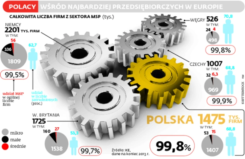 Rzut oka na statystyki Komisji Europejskiej wystarczy, żeby zobaczyć Polskę jako jeden z najbardziej przedsiębiorczych krajów w Unii Europejskiej. Dwa razy większe od nas – pod względem liczby ludności – Niemcy mają jedynie około 700 tys. więcej firm, a mikroprzedsiębiorstw ledwie 400 tys. więcej. Ta kategoria biznesu zapewnia pracę już 5,67 mln Polaków, skupiając ponad dwie trzecie zatrudnionych. Dodatkowo z ostatnich dostępnych opracowań Polskiej Agencji Przedsiębiorczości wynika, że sektor małych i średnich firm odpowiada w Polsce za 47,3 proc. produktu krajowego brutto.