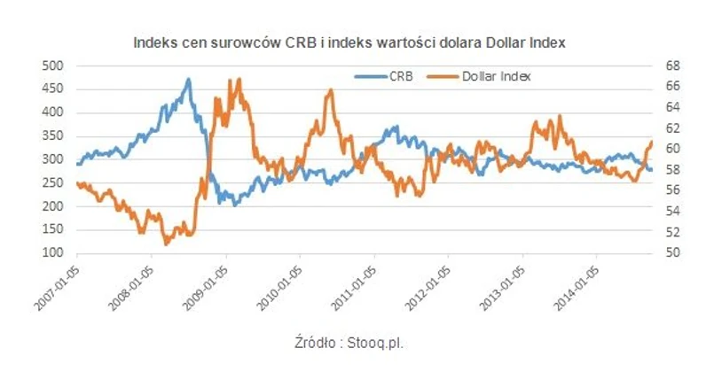 Jednym z najbardziej rzucających się w oczy zjawisk jest wyraźna ujemna korelacja tendencji na rynku surowców ze zmianami kursu dolara. Dollar Index, odzwierciedlający siłę amerykańskiej waluty wobec koszyka składającego się z franka szwajcarskiego, euro, funta i jena, od początku lipca poszedł w górę o ponad 6 proc. W tym czasie kurs euro wobec dolara zniżkował o prawie 9 proc. Wcześniej, w pierwszym półroczu 2014 r., zwyżkom na giełdach towarowych towarzyszyło osłabienie się dolara, sygnalizowane przez spadek indeksu tej waluty o 3 proc. Warto jednak za uważyć, że dynamiczna tendencja osłabiania dolara rozpoczęła się już w lipcu 2013 r., ale indeks surowców zupełnie na nią nie reagował, dostrzegając ją niemal pół roku później. Nie zwlekał już jednak z reakcją na odwrócenie trendu notowań dolara.
