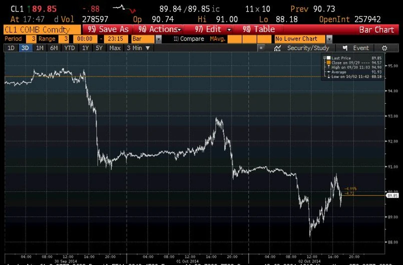 Po wczorajszych spadkach cena ropy WTI dziś od rana notowała kolejne zniżki. W ciągu dnia cena za baryłkę zeszła poniżej 90 dol. i osiągnęła poziom 88,18 dol., potem jednak znów wzrosła.