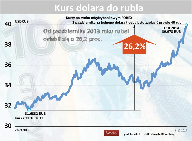 Znakomitymi wskaźnikami koniunktury gospodarczej w danym kraju jest kondycja waluty. Podczas gdy udział juana w handlu walutami oraz międzynarodowych rozliczeniach handlowych rośnie, rubel przechodzi przez wielki kryzys. Kurs rosyjskiej waluty notuje dziś najniższy poziom od czasu rozpadu ZSRR i dewaluacji waluty po silnym kryzysie w 1998 r. W ciągu ostatniego roku rubel stracił ponad jedną piątą swojej wartości w stosunku do dolara. 22 października 2013 roku za jednego dolara kupujący płacili 31,6 rubla, rok później - 22 września - za tego samego dolara musieli już wydać 38,6 rubli.