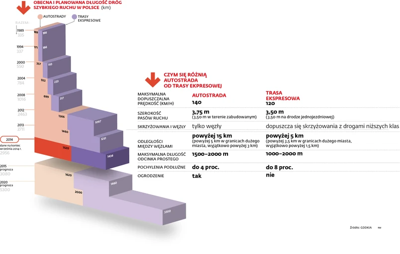 Dla kierowcy różnica między autostradą i trasą ekspresową jest pod względem warunków jazdy prawie niewidoczna. Jest za to znacząca dla jego portfela: po ekspresówkach jeździ się – przynajmniej na razie – za darmo. Są też tańsze w budowie. Według analityka transportowego Adriana Furgalskiego w przeliczeniu na kilometr ekspresówka jest od 10 do 30 proc. tańsza od autostrady, bo trzeba wykupić mniej gruntów, nie trzeba budować miejsc obsługi podróżnych itd.
