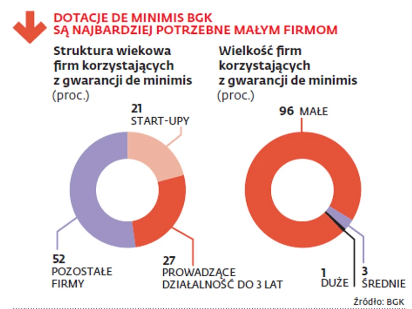 W ciągu półtora roku od wprowadzenia gwarancji do września 2014 r. skorzystało z nich ponad 65 tys. przedsiębiorców, którzy zadłużyli się na przeszło 22 mld zł. Z danych BGK wynika, że 96 proc. beneficjentów to małe firmy, a jedynie 1 proc. – duże. Prawie połowa z podmiotów, które pozyskały kredyt z gwarancją, to przedsiębiorstwa młode, prowadzące działalność od roku do 3 lat – 27 proc. oraz start-upy – 21 proc. – Gwarancja de minimis jest doskonałym udogodnieniem, szczególnie dla przedsiębiorców, którzy nie posiadają rzeczowego zabezpieczenia kredytu – uważa Izabela Sławińska, menedżerka zespołu kredytów małych i średnich firm BZ WBK.