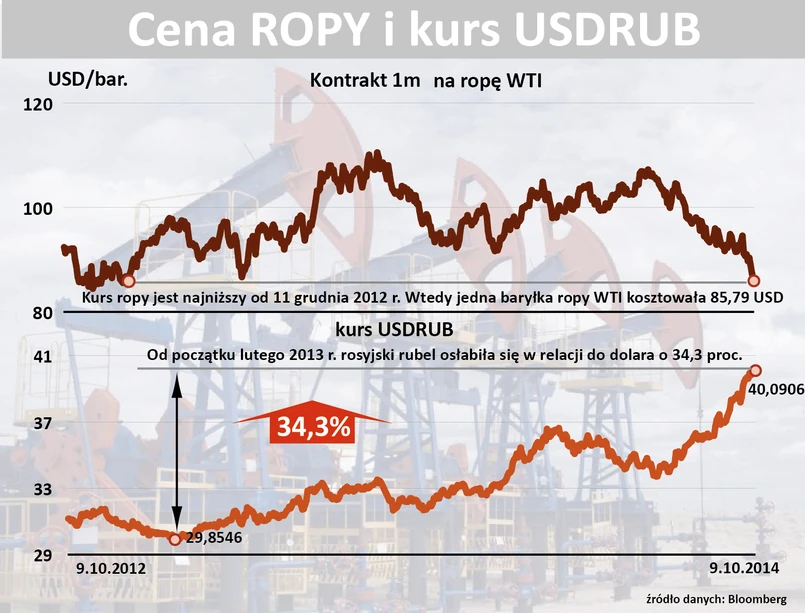 Spadające ceny ropy naftowej to poważny problem dla Rosji. Moskwa większość dochodów czerpie ze sprzedaży surowców – ropy naftowej i gazu ziemnego. Obecny budżet Rosji zakłada, że cena za baryłkę ropy wynosi 104 dol. Gdyby cena ta gwałtownie spadała np. do poziomu 80 dol. za baryłkę, Rosja miałaby poważny problem z finansami - wyjaśniał portalowi Forsal.pl Jarosław Kosaty z PKO BP. >>> Czytaj więcej o wpływie ceny ropy naftowej na rosyjski budżet