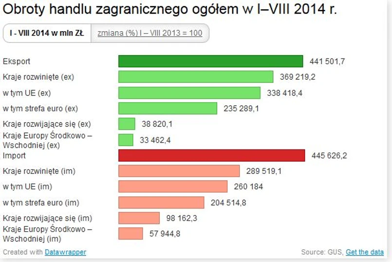 Eksport w okresie styczeń-sierpień 2014 r. wzrósł o 4,4 proc. r/r do 105,80 mld euro, zaś import zwiększył się o 4,2 proc. r/r do 106,79 mld euro, podał Główny Urząd Statystyczny (GUS).