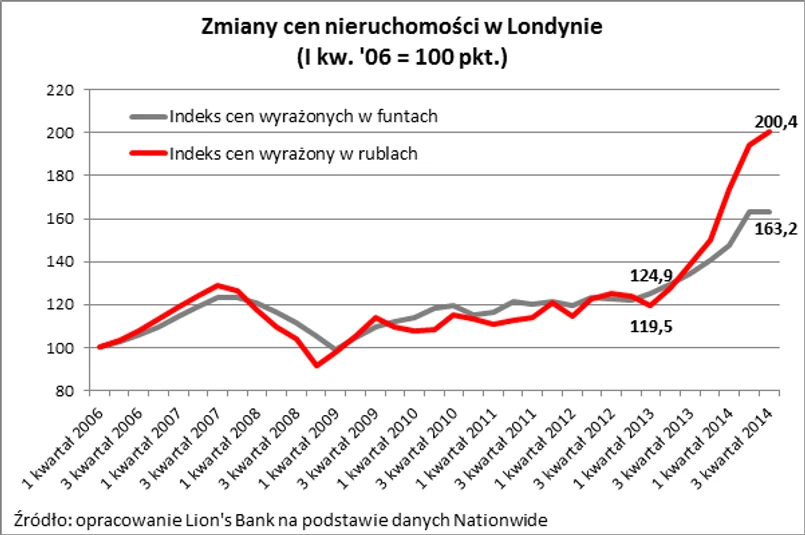 W tym pierwszym przykładzie pominęliśmy fakt, że w międzyczasie mogło dojść do zmiany poziomu cen nieruchomości w danym kraju. Zmieńmy więc to założenie i zobaczmy jak mogła wyglądać inwestycja w apartament w Londynie z punktu widzenia Rosjanina. Załóżmy, że do zakupu nieruchomości wartej 1 mln euro doszło w pierwszym kwartale 2013 r. Do końca 3 kwartału br. z tytułu wzrostu cen nieruchomości na Londyńskim rynku inwestor mógłby się cieszyć faktem, że jego nieruchomość jest obecnie warta około 1,3 mln funtów, a więc o 30 proc. więcej niż w dniu nabycia. W międzyczasie rubel stracił też sporo na wartości. Gdyby inwestor postanowił nieruchomość sprzedać i wymienić otrzymane funty na rosyjską walutę zarobiłby aż 67,7 proc. Dwukrotnie wyższy zysk z inwestycji zawdzięcza się w tym wypadku osłabieniu się rubla wobec funta.