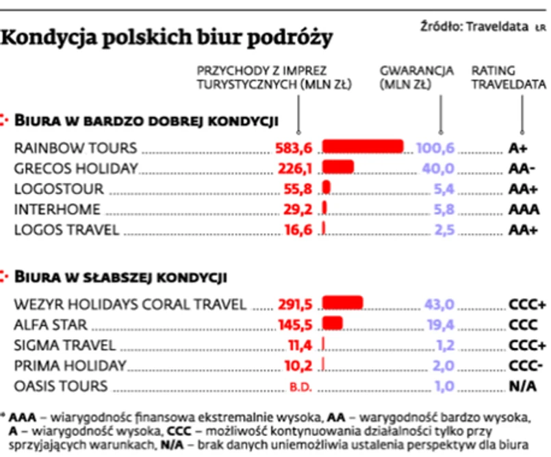 Eksperci z TravelData, firmy nadającej ratingi podmiotom z branży turystycznej, wymieniają jednak Alfa Star wśród biur, które mają możliwość kontynuacji działalności tylko przy sprzyjających warunkach. Do tej samej kategorii zaliczają Wezyr Holiday, Prima Holiday, Sigma Travel oraz Oasis Tours. W przypadku ostatniego z biur wynika to jednak wyłącznie z tego, że nie dostarcza ono na bieżąco danych do KRS. – Prima Holiday jest natomiast młodym biurem, i jak każdy inny podmiot na początku przeżywa trudności. Ich efektem są niskie przychody oraz brak funduszy własnych – tłumaczy Andrzej Betley.