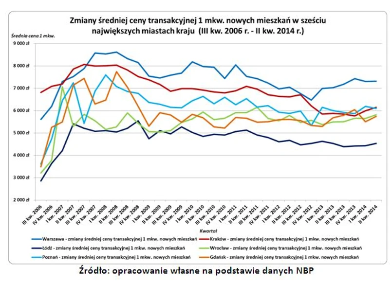 Wykres obok dostarcza informacji na temat średnich cen transakcyjnych nowych mieszkań. Zaprezentowane zmiany dotyczą sześciu krajowych metropolii (Warszawy, Krakowa, Łodzi, Wrocławia, Poznania i Gdańska). Najstarsze dane o tamtejszych cenach transakcyjnych NBP zebrał w III kw. 2006 r. Żadna instytucja wcześniej nie prowadziła regularnego monitoringu stawek transakcyjnych. W rezultacie analiza musi rozpocząć się od jesieni 2006 r. Już wtedy można było zaobserwować kredytowy boom. Kulminacja wspomnianego zjawiska miała miejsce dwa lata później. Bezpośrednim skutkiem „gorączki hipotecznej” był gwałtowny wzrost przeciętnych cen nowych lokali. W każdej z sześciu krajowych metropolii ta zmiana przebiegała nieco inaczej (patrz wykres).