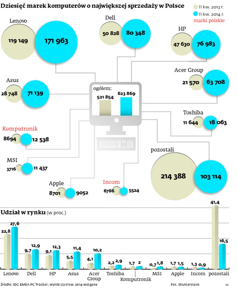 – Jeszcze kilka lat temu notebooki produkowane były również przez polskie firmy, np.: Actina, NTT, Aristo czy California Access – mówi Filip Kałasa z Komputronika, e-sklepu handlującego komputerami. Tłumaczy, że firmy lokalne, nie mając tak wielu modeli do wyboru jak A-brandy (firmy sprzedające swoje produkty na całym świecie), nie były w stanie z nimi konkurować. Wynika to z gorszych warunków zakupu podzespołów, a także wyższych kosztów związanych z serwisem czy logistyką. Bo giganci rynku mają bardzo silny argument w postaci ceny oferowanych produktów. W przeciwieństwie do tych mniejszych mogą pozwolić sobie na znaczne obniżki cen swoich produktów i atrakcyjne promocje.