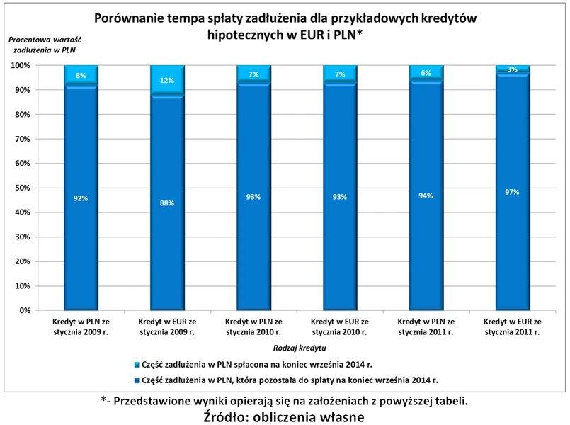 Wielu nabywców mieszkań, którzy zaciągnęli kredyt we franku szwajcarskim, teraz musi zmagać się ze wzrostem złotówkowego zadłużenia. „Hipoteki” rozliczane w euro na razie nie sprawiają aż takich kłopotów. W przypadku trzech analizowanych kredytów walutowych spłata rat obniżyła złotówkową wartość długu o 12 proc. (kredyt z początku 2009 r.), 7 proc. (kredyt z początku 2010 r.) oraz 3 proc. (kredyt z początku 2011 r.). Co ciekawe, posiadacz walutowej „hipoteki” od stycznia 2009 r. do września 2014 r. pomniejszył swoje zadłużenie bardziej niż osoba spłacająca kredyt w złotym. Ze względu na znacznie niższe oprocentowanie walutowe raty zawierały więcej kapitału i mniej odsetek. Trzeba jednak pamiętać, że po ewentualnym wzroście notowań euro taka przewaga na rzecz kredytu walutowego szybko zniknie.