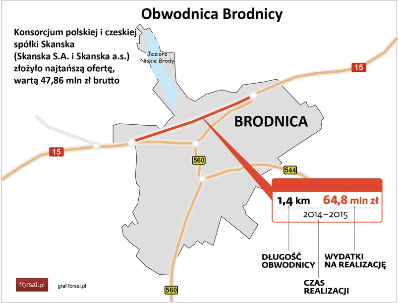Inwestycja zakłada m.in. budowę nowej jezdni drogi nr 15, budowę estakady nad ul. Wiejską, torami PKP i terenami zalewowymi rzeki Łacha. Pierwszy etap budowy obwodnicy Brodnicy został już zrealizowany w 2011 roku. Polegał on na budowie ronda, które połączyło ulicę Podgórną za pośrednictwem trasy przemysłowej z ulicą Sądową.