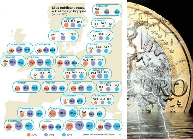 O ile jednak w kwestii redukowania deficytów budżetowych większość państw Unii notuje postępy, o tyle z ograniczaniem długu publicznego idzie już gorzej. We wszystkich 28 państwach UE dług publiczny liczony jako odsetek PKB jest dziś wyższy niż w roku 2007 r., czyli ostatnim przed wybuchem światowego kryzysu, przy czym w 11 jest on wyższy co najmniej dwa razy. W 2007 r. dług publiczny mieszczący się poniżej dopuszczalnej przez Komisję Europejską granicy 60 proc. PKB miało 19 państw członkowskich, a dwa kolejne przekraczały ten poziom tylko nieznacznie. Jedynie dwa kraje miały dług publiczny przekraczający 100 proc. ich PKB, za to w trzech był on na poziomie jednocyfrowym. W bieżącym roku, według najnowszej prognozy Międzynarodowego Funduszu Walutowego, wartości poniżej 10 proc. nie osiągnie nikt, za to krajów z zadłużeniem ponad 100 proc. będzie już sześć. Liczba krajów mieszczących się w pułapie 60 proc. spadła do 12, czyli są już one w mniejszości.