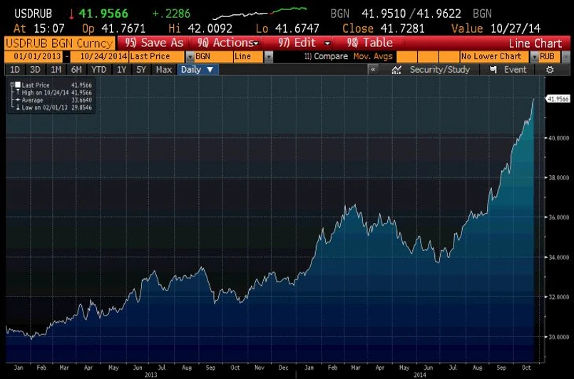 Rosyjski dziennik „Wiedomosti” zwraca uwagę, że od początku roku rubel stracił na wartości aż 25 proc. Spadki powyżej 20 proc. w skali roku, uznawane są „kryzys walutowy”. Dziś za jednego dolara trzeba zapłacić ponad 42 ruble, a za jedno euro prawie 53 ruble. Gdy dwa lata temu cena jednego euro podskoczyła w Rosji do 43 rubli, Rosjanie zaczęli pozbywać się rodzimej waluty.